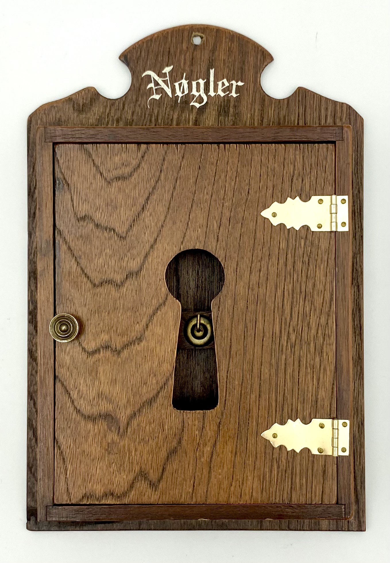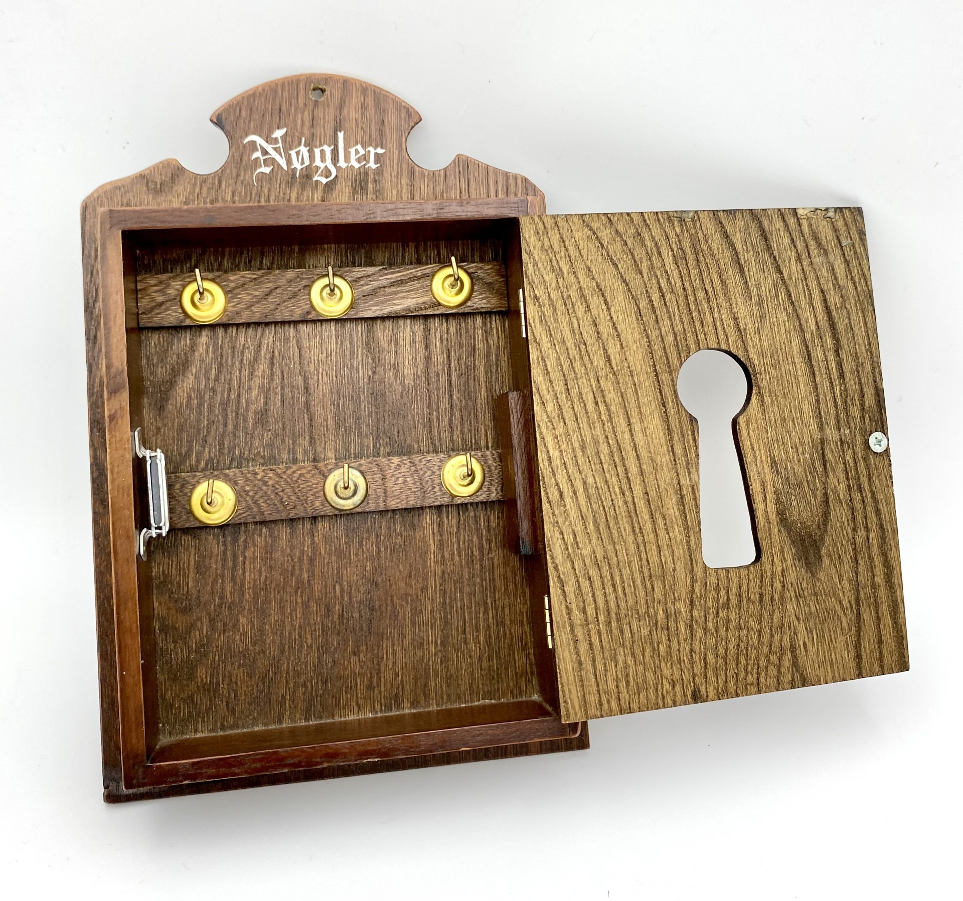 Gammelt nøgleskab i mørkt træ med 6 nøgle-kroge. Skabet har magnetlukning, som gør det nemt at åbne & lukke.