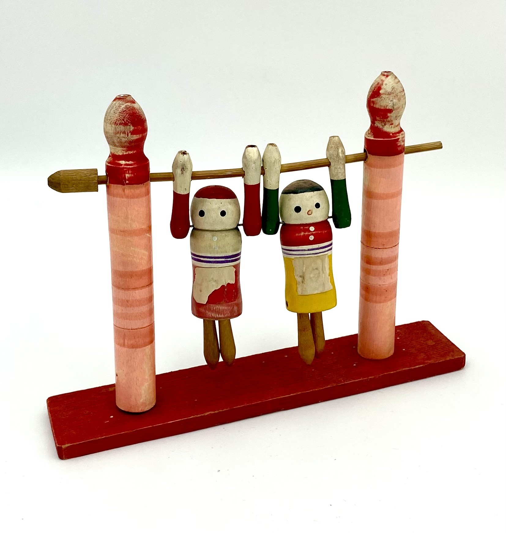 Retro japansk akrobat-legetøj i malet træ fra 1950'erne. Figurerne laver "gymnastik", når pinden drejes rundt.