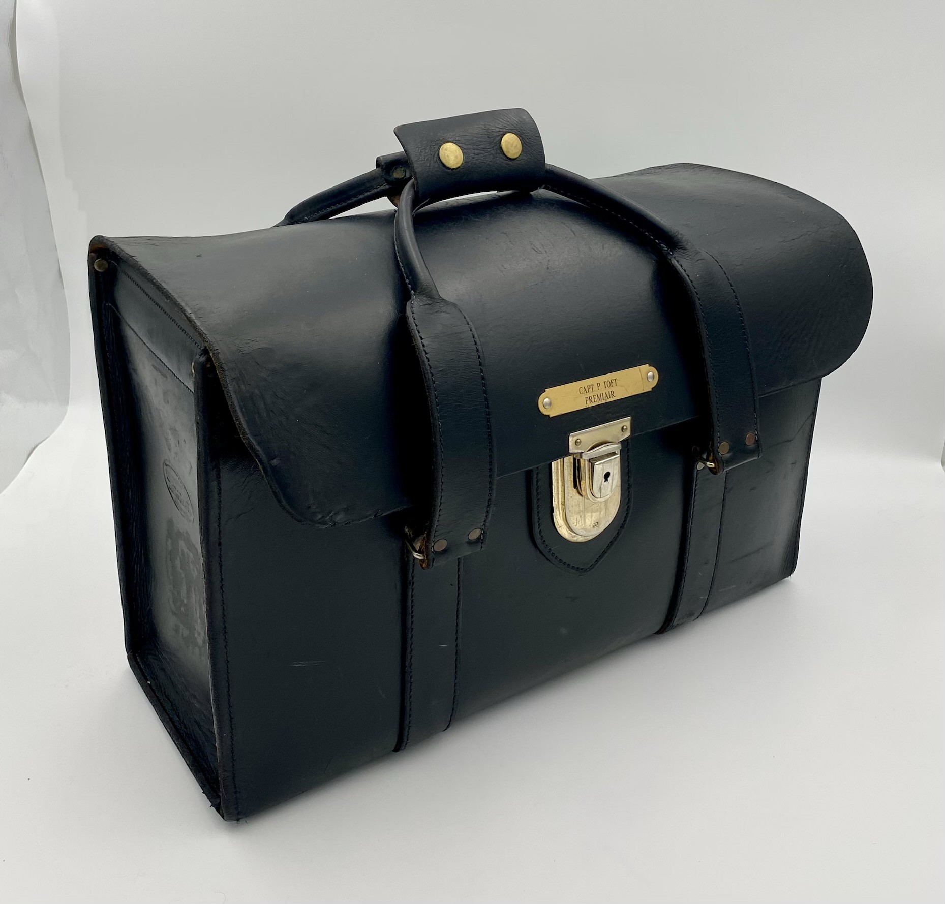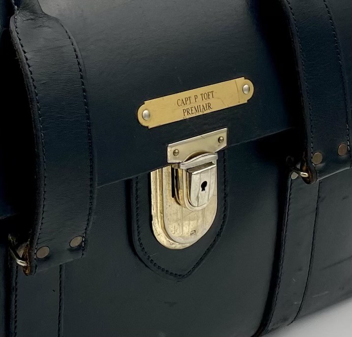 Denne taske har tilhørt piloten: "Kaptajn P. Toft", som det fremgår på den lille messingplade (se billede 2). Tasken har formentlig fulgt ham hele hans karriere, hvor navneskiltet så har været skiftet ud efter de flyselskaber, han arbejdede hos. Som det ses, stammer dette navneskilt f.eks. fra en periode, hvor han fløj for "Premiair".