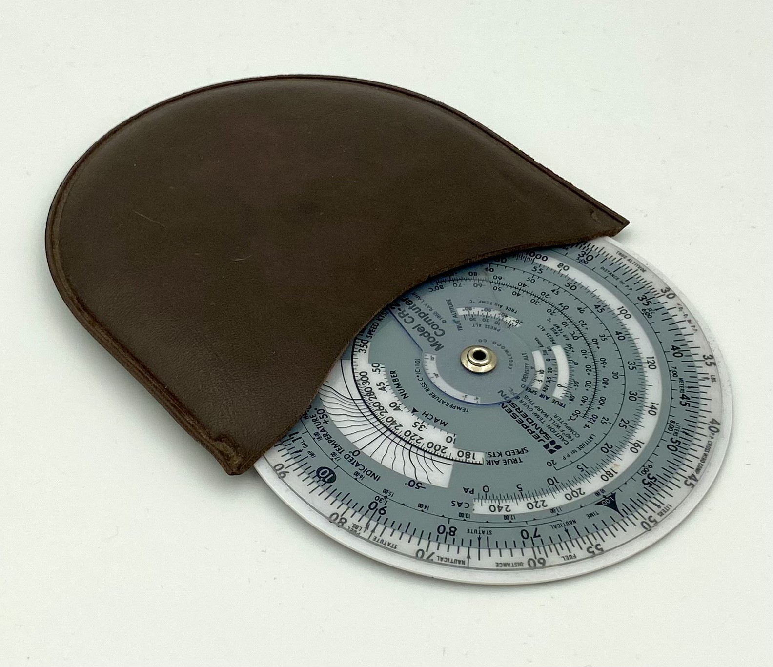Med tasken følger også en gammeldags navigations-regnestok i et fint læder-etui fra 1955 (se billede 4).