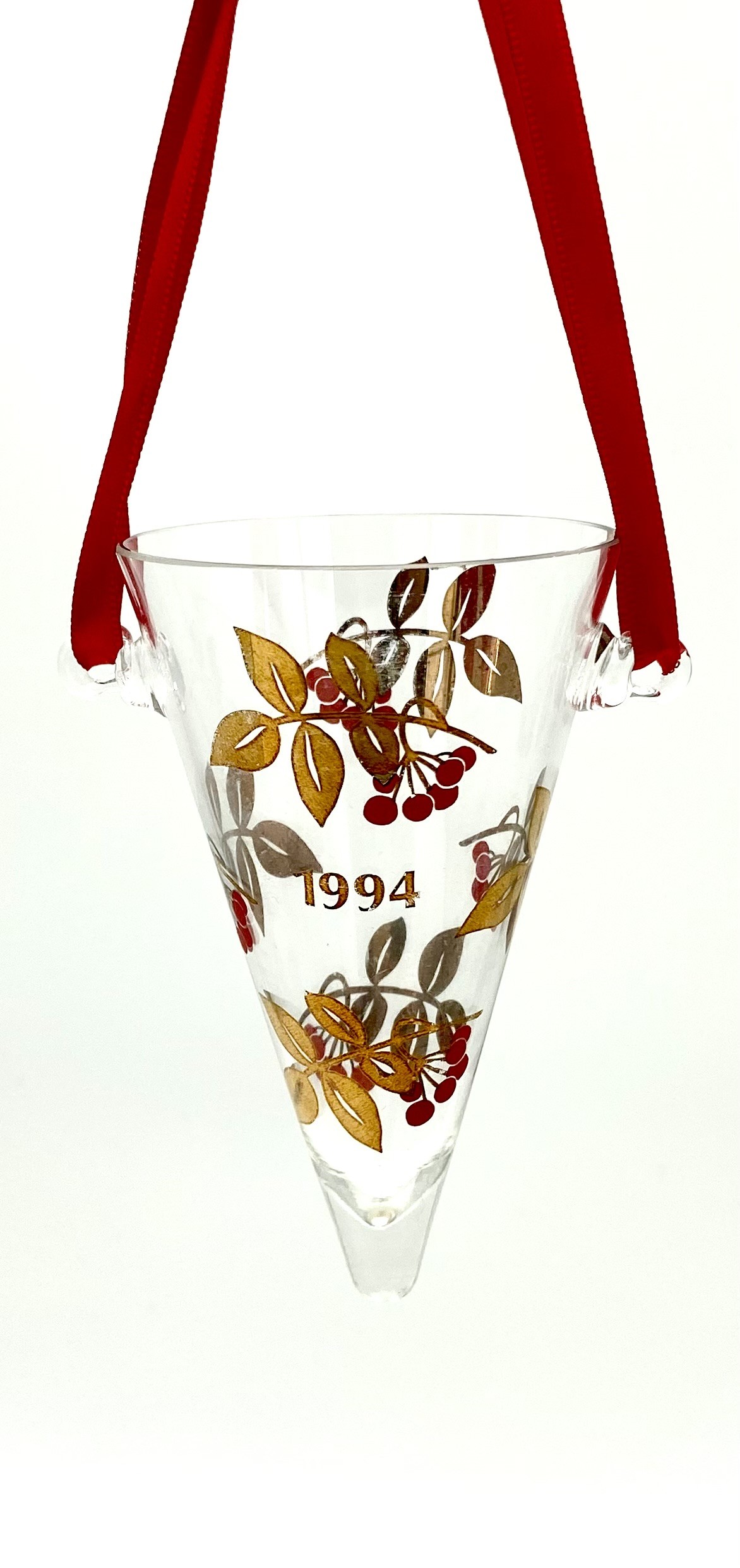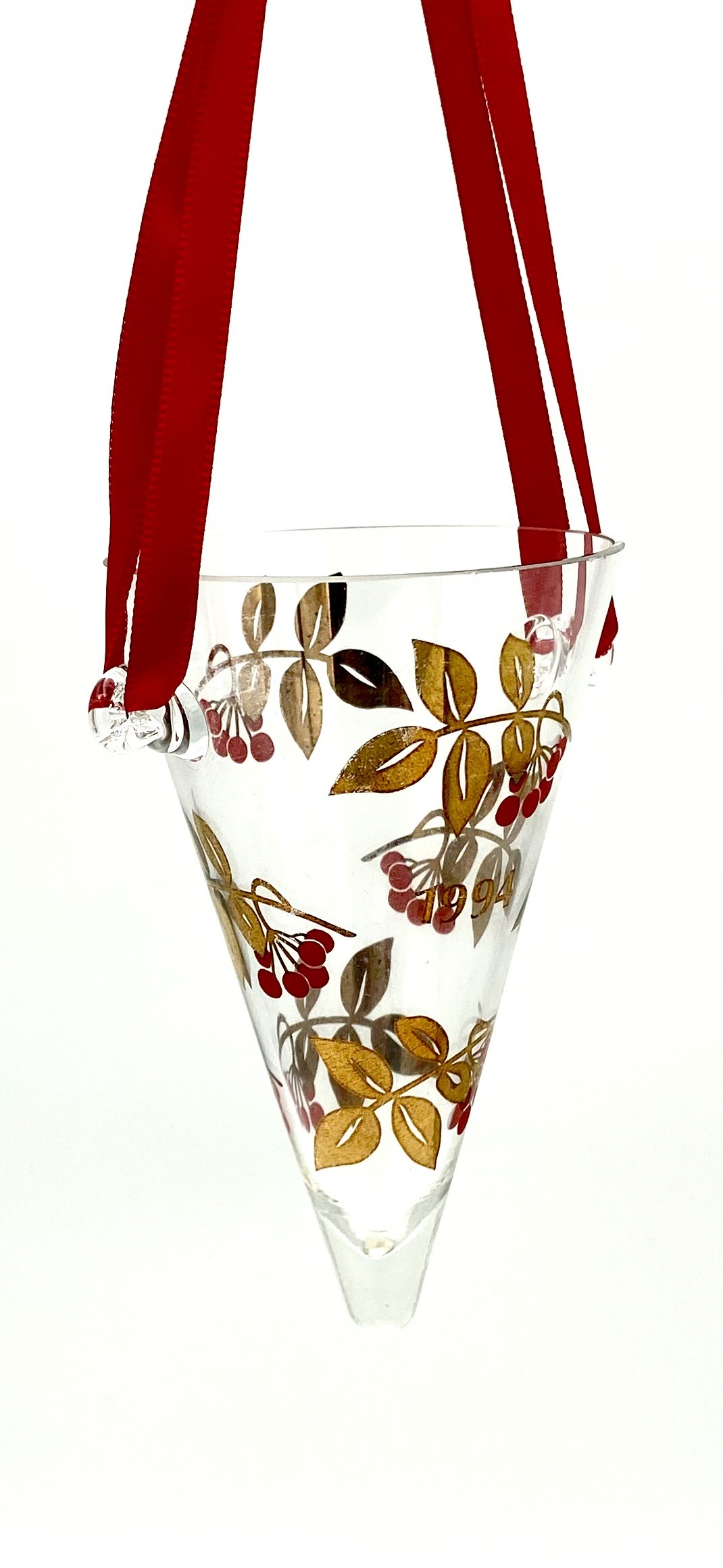 Holmegaard Christmas "Årets Kræmmerhus" fra år 1994. Kræmmerhuset har påtrykt julemotiv i 24 karat guld.
