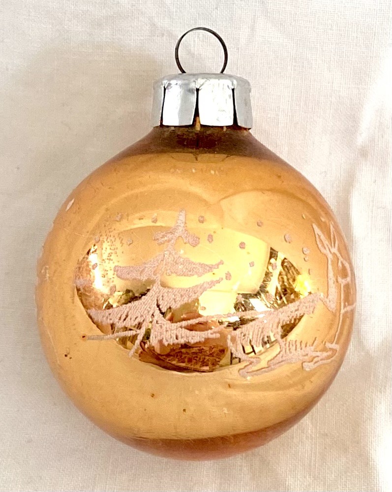 Gammel kobberfarvet glaskugle med rensdyrmotiv.