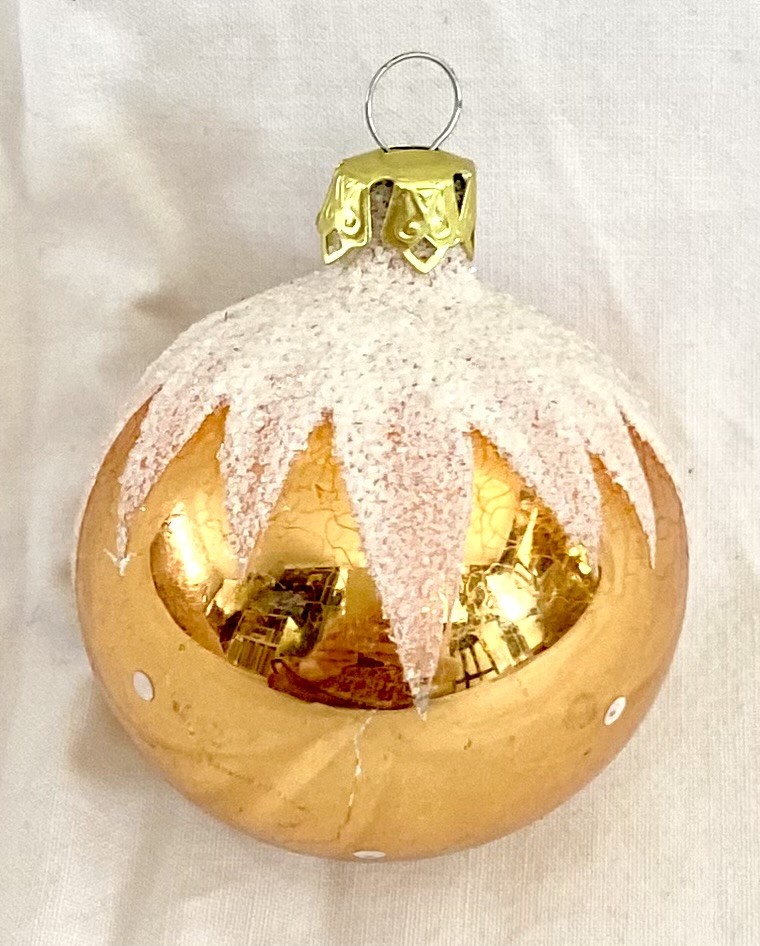 Gammel kobberfarvet glaskugle med sølvfarvet glimmer.
