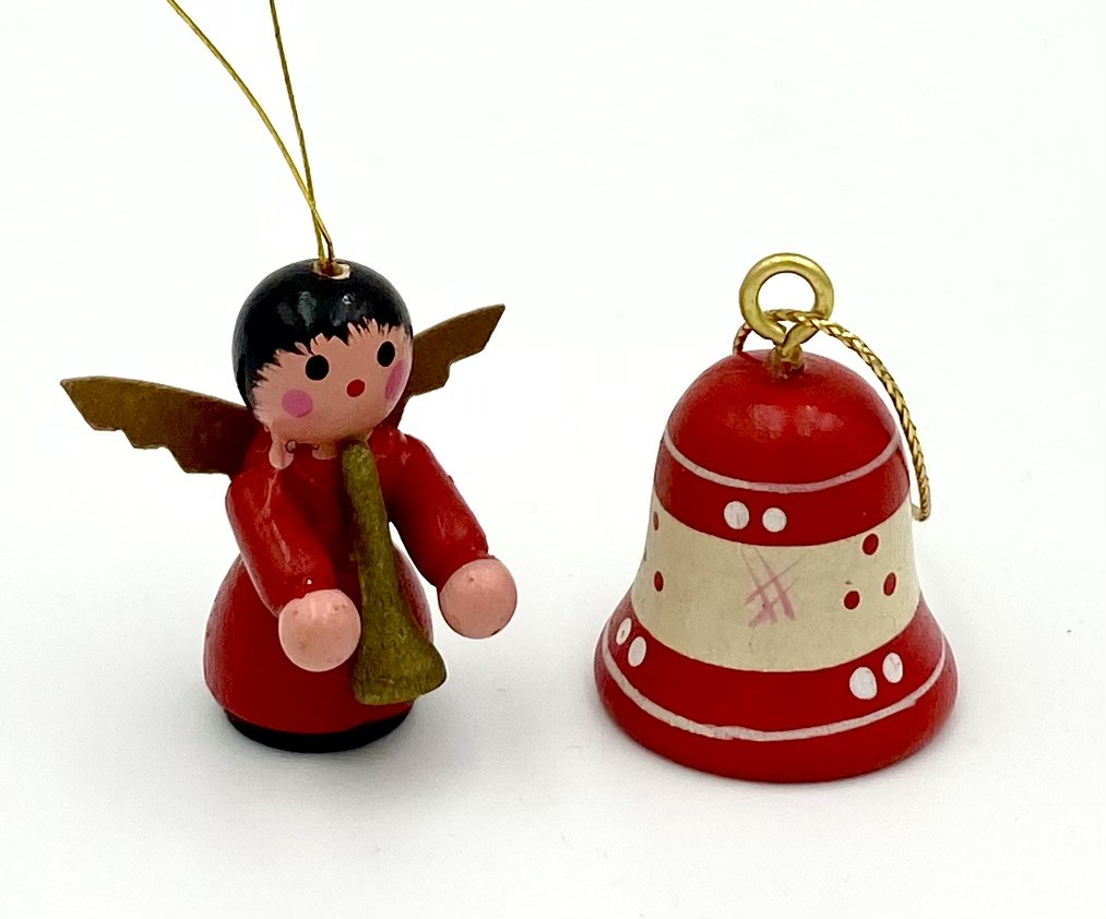Retro juleophæng i form af musik-engel & klokke fra Daells Varehus. Figurerne er udført i malet træ.