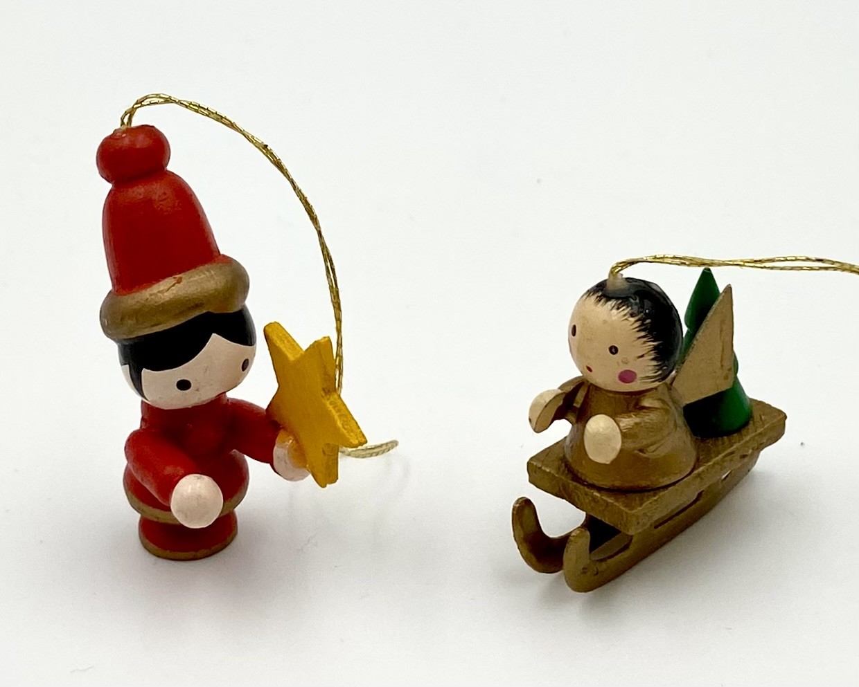 Retro juleophæng i form af nisse & engel på kælk fra Daells Varehus. Figurerne er udført i malet træ.