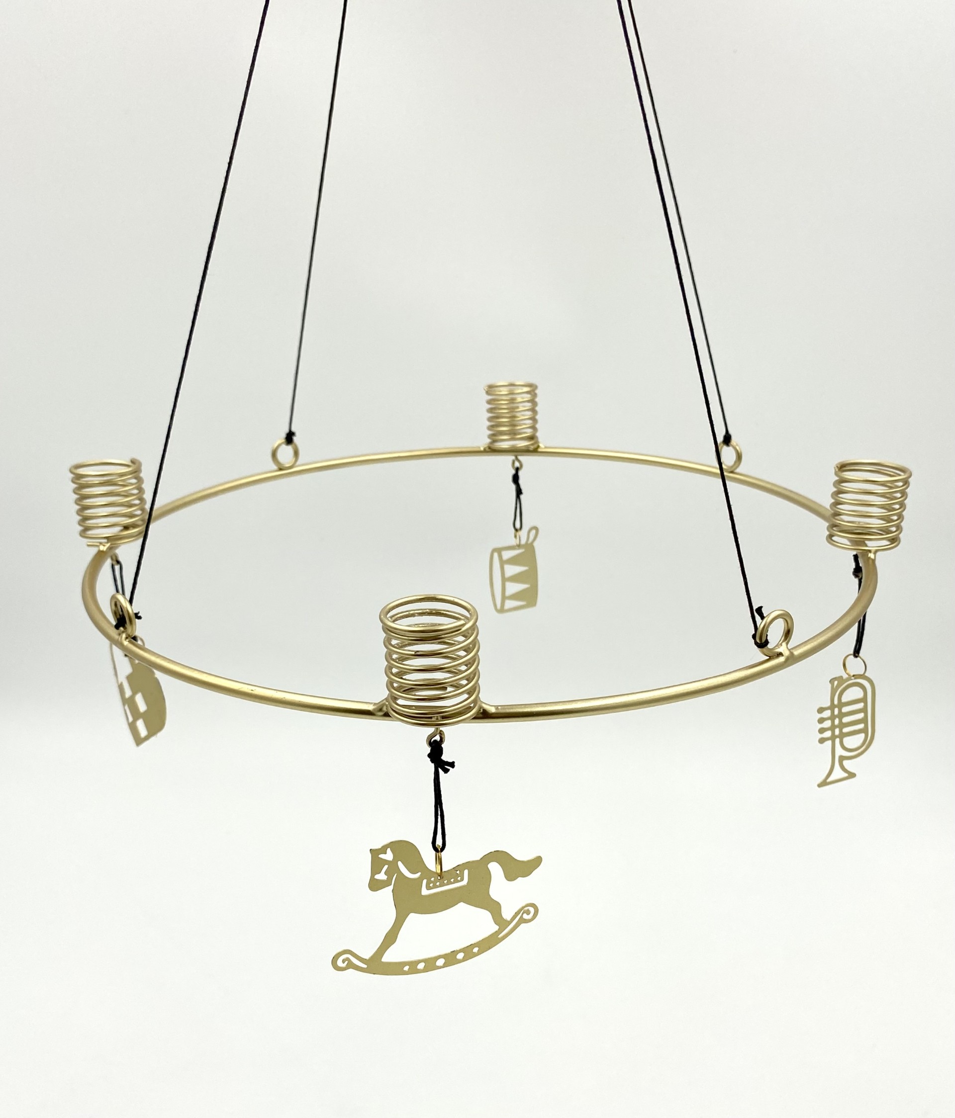 Gammeldags adventsstage til ophæng i forgyldt metal. Kransen er smykket med 4 elegante vedhæng i form af julehjerte, gyngehest, tromme & trompet. Lyseholderne er beregnet til almindelige kronelys.
