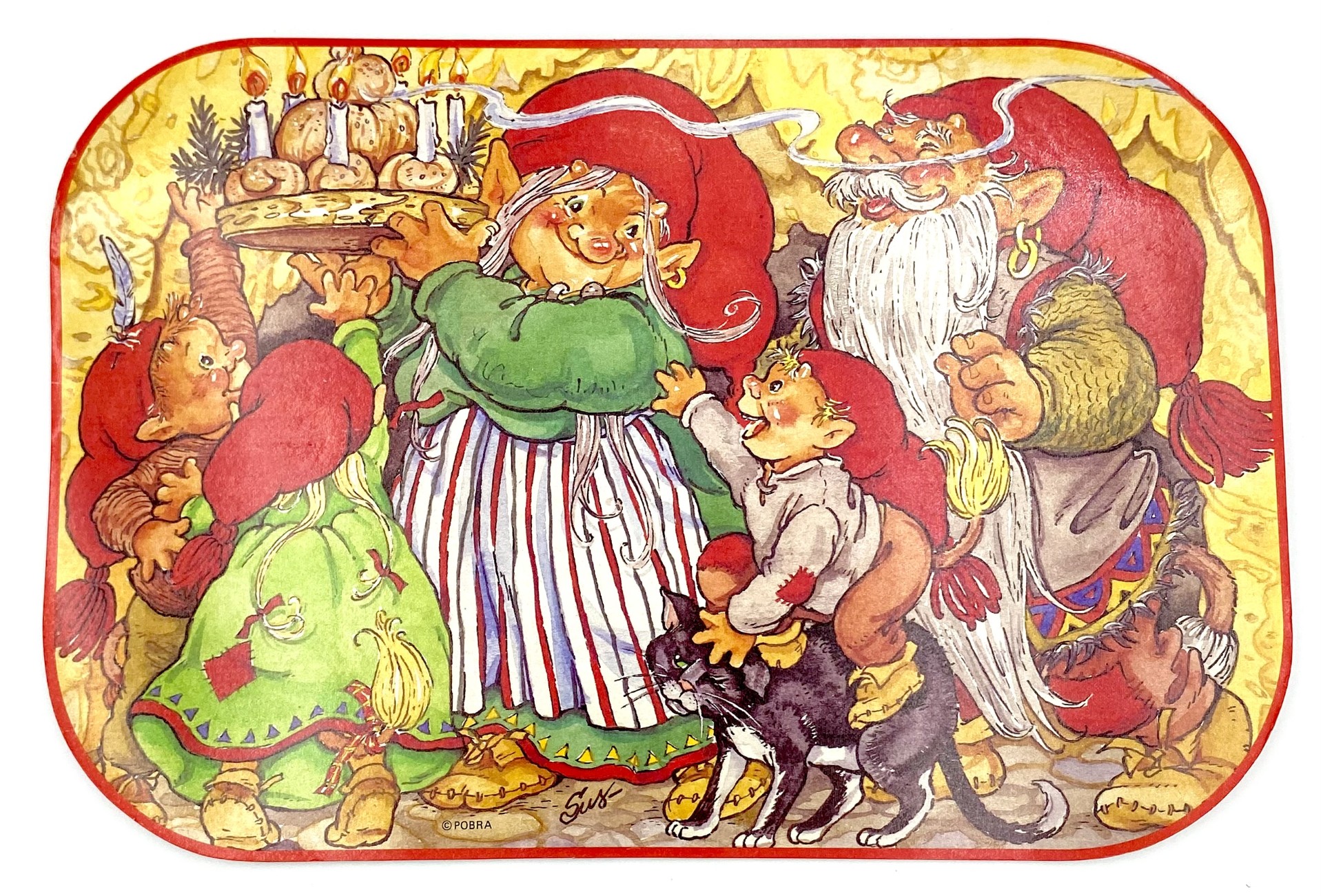 Susanna Hartmann jule-dækkeserviet med nissemotiv i kraftigt karton.