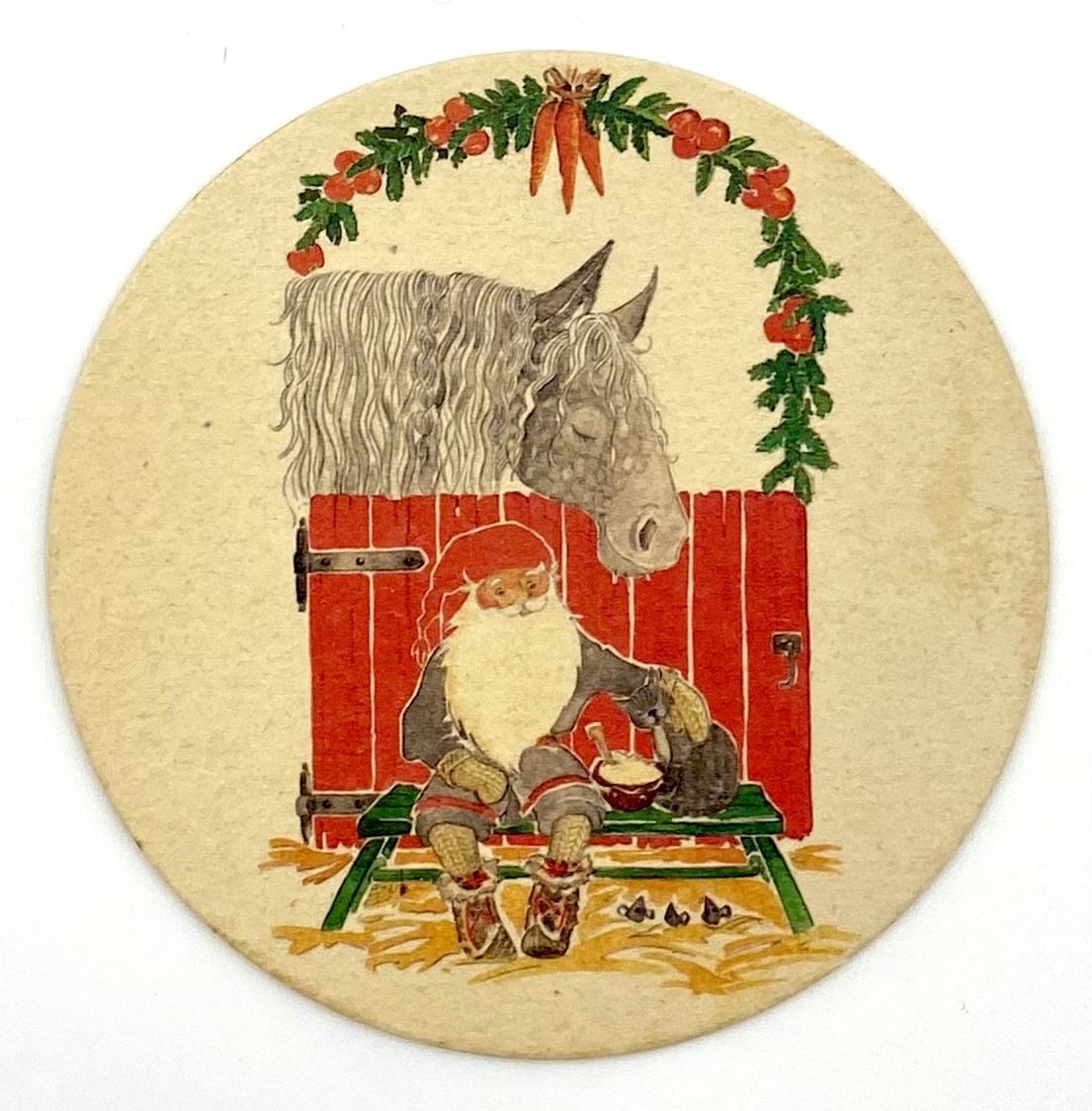 Gammel jule-glasbrik med motiv af stald-nisse i kraftigt pap-materiale.
