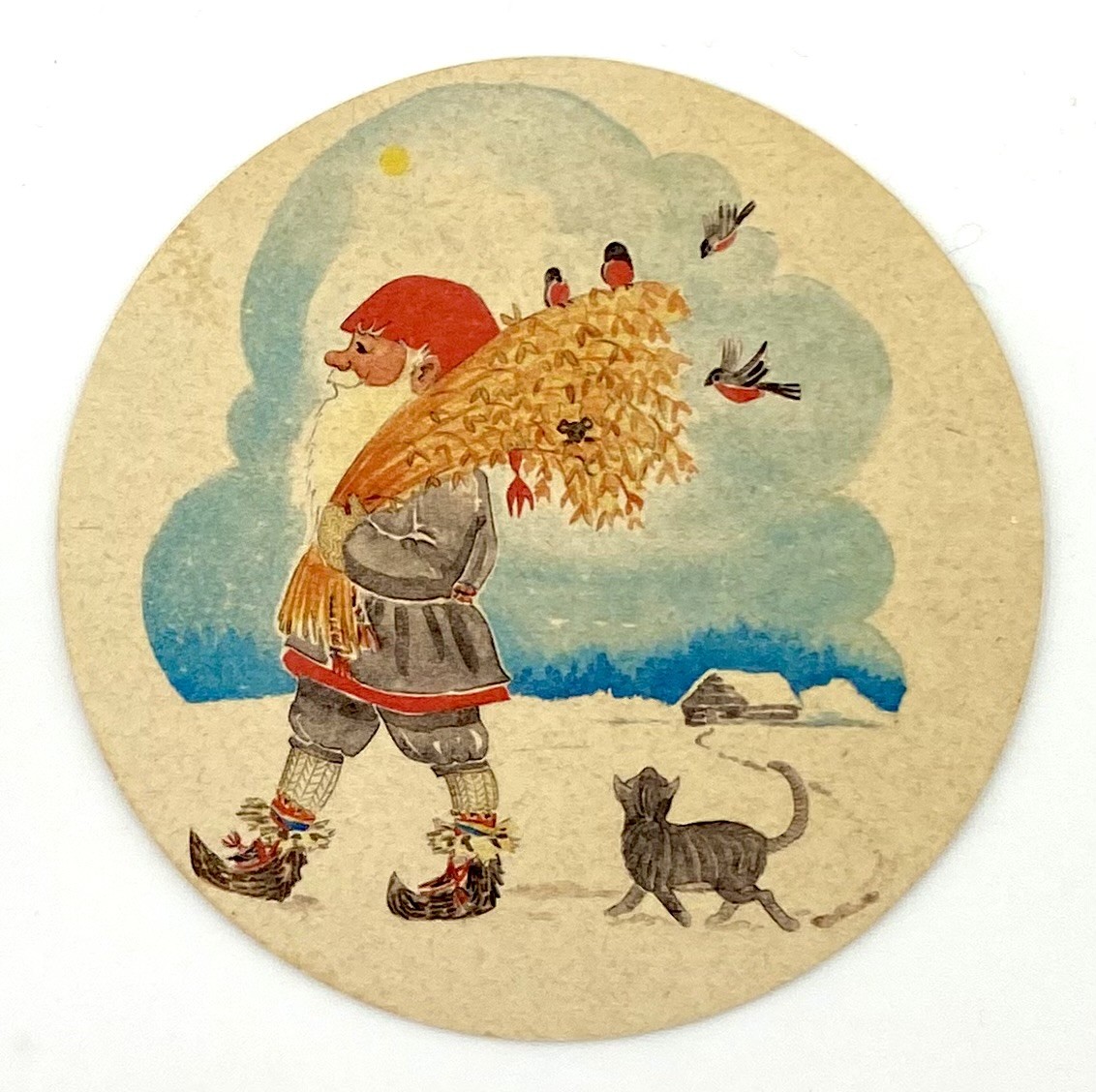 Gammel jule-glasbrik med motiv af nisse med juleneg i kraftigt pap-materiale.