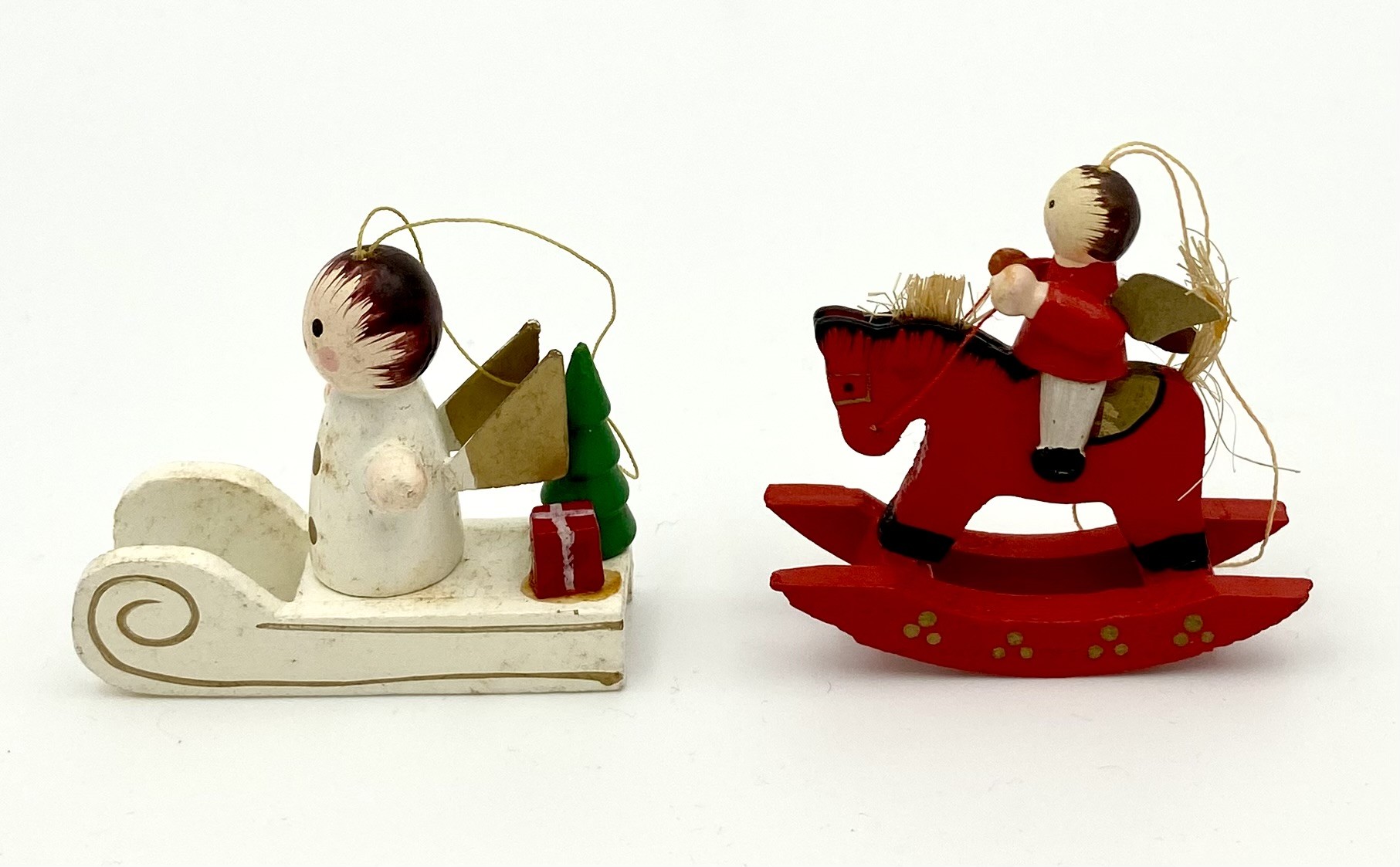 Retro juleophæng i form af engle på gyngehest & kælk fra Daells Varehus. Figurerne er udført i malet træ.