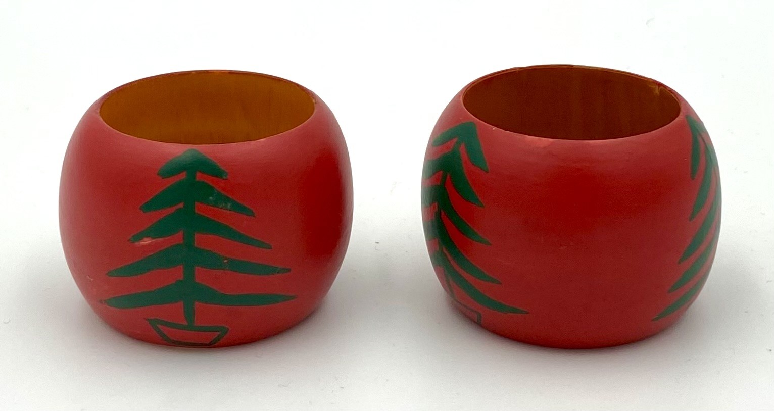 Retro jule-servietringe med juletræsmotiver i håndmalet træ.
