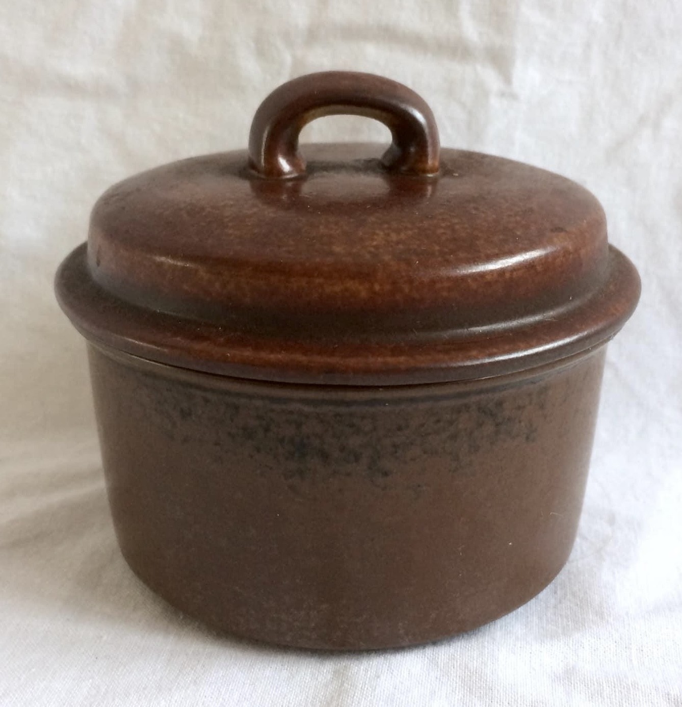 Ruska sukkerskål med låg i brunt stentøj fra det finske Arabia.