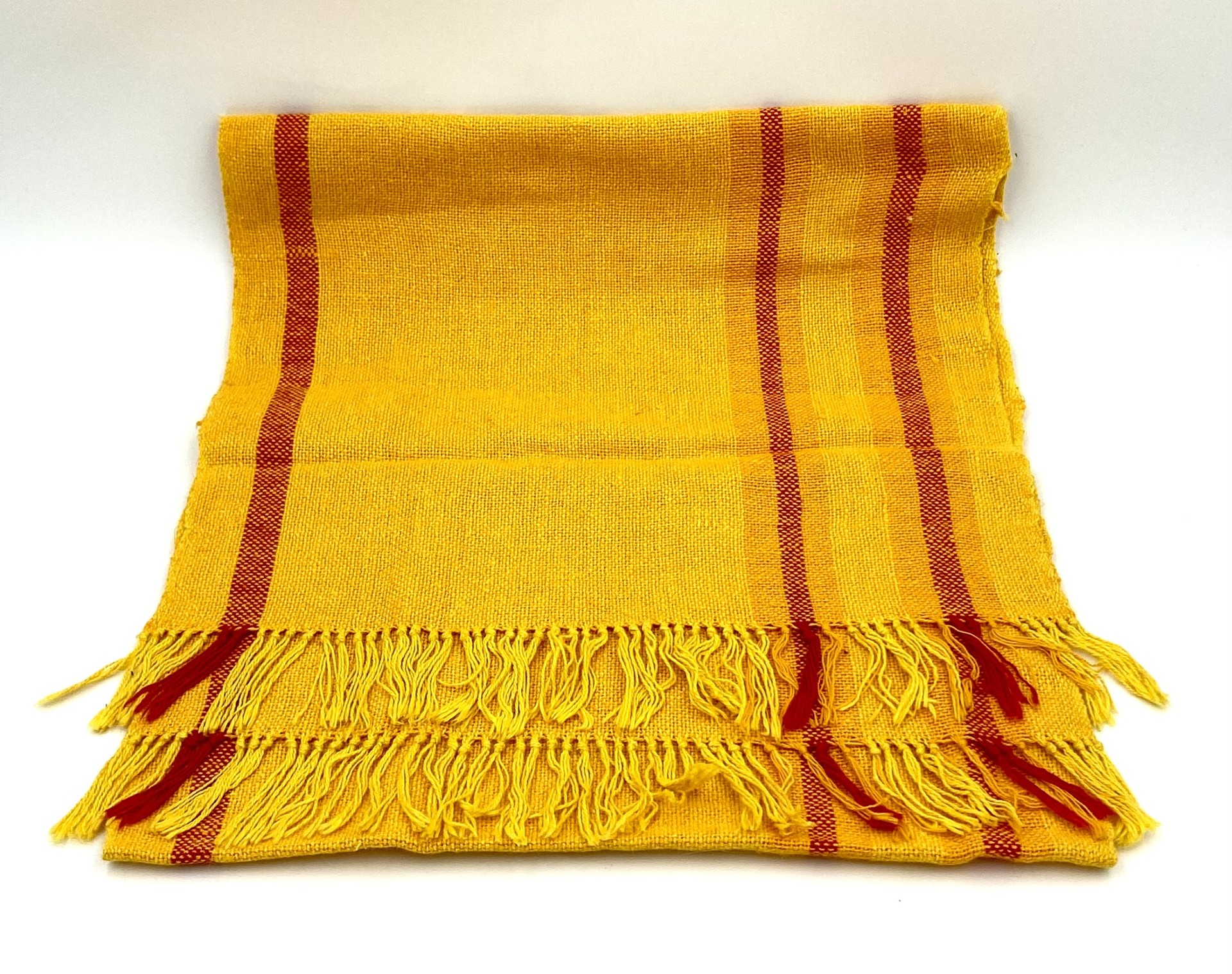 Retro påske-bordløber i gult hør-stof med røde & orange striber.