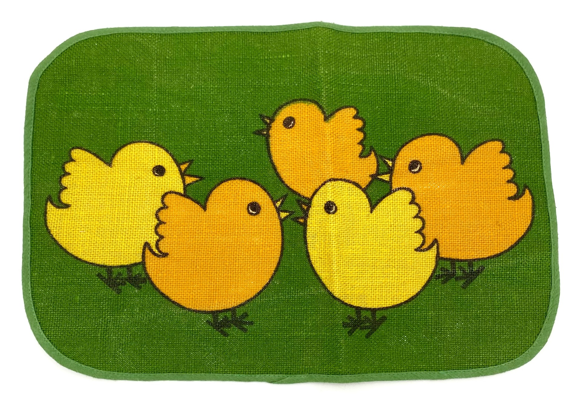 Retro påske-dækkeserviet med kyllinge-motiv af ukendt fabrikat. Dækkeservietten er udført i sækkelærred & skønnes at være produceret i 1960'erne.