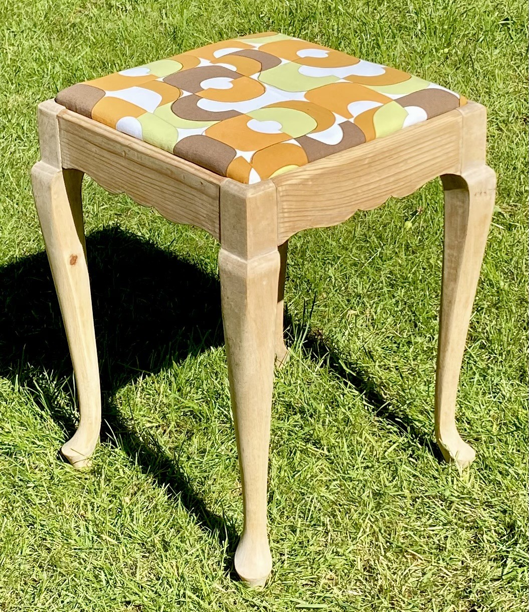 Gammel skammel i massivt træ med ny-betrukket sæde i retro-insprireret stof.