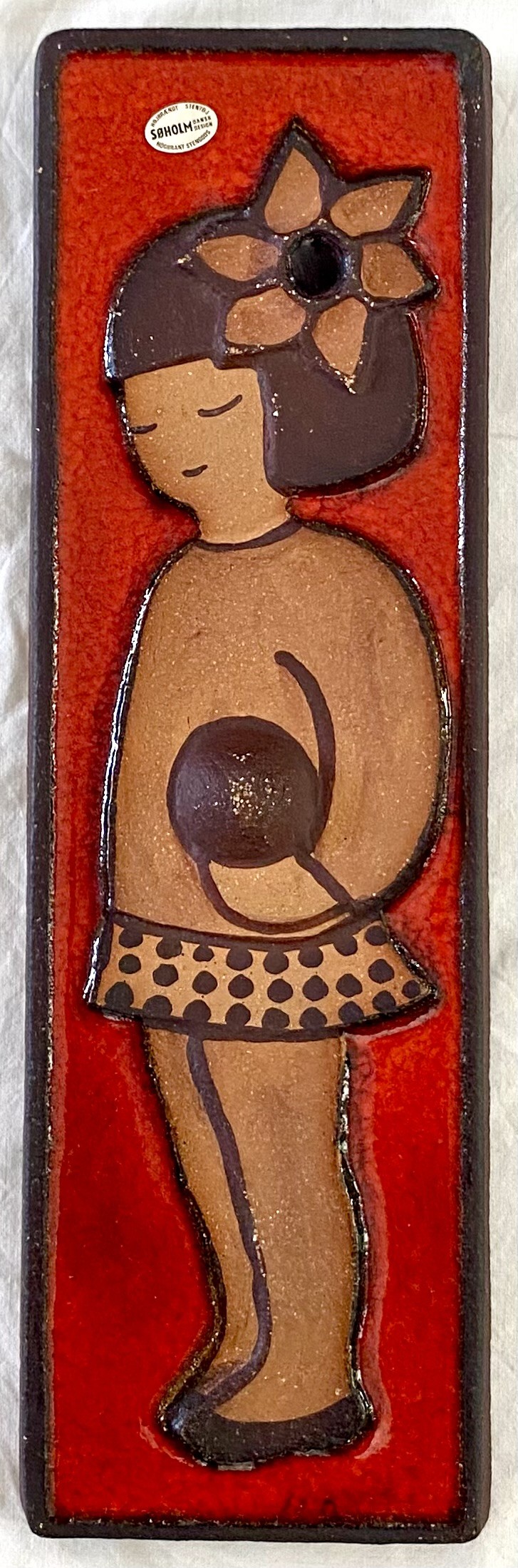 Vægrelief med motiv af "Pige Med Bold" i rødglaseret stentøj fra Søholm Keramik - designet af Noomi Backhausen i år 1978.