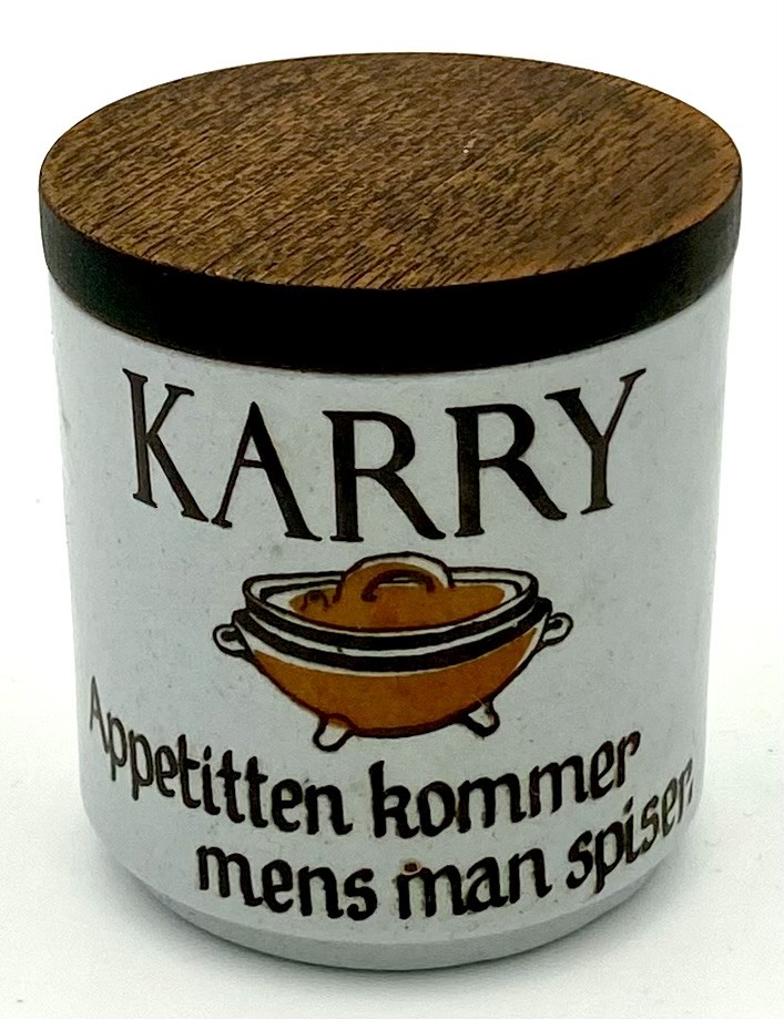 "Ordsprogsserien" karry-krydderikrukke med låg i teaktræ fra Knabstrup Keramik.