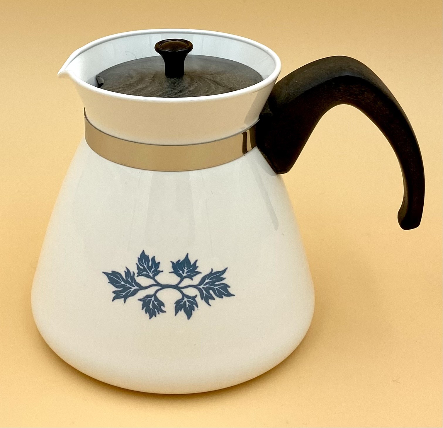 Retro "Blue Leaf" kaffekolbe i hvid emalje fra Pyroflam Holland - produceret i 1960'erne. Kanden er udstyret med plasthåndtag & låg i plast & glas.