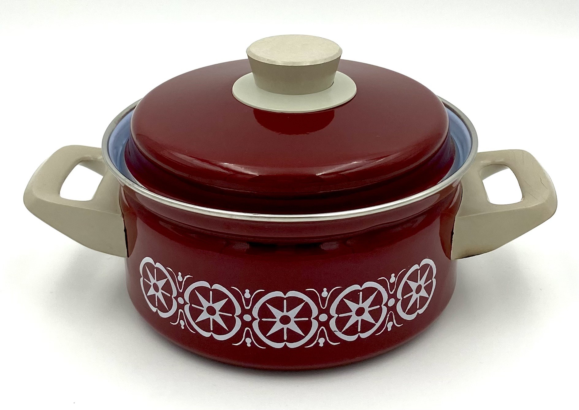 Mørkerød & hvid emalje-gryde med retro-mønster.