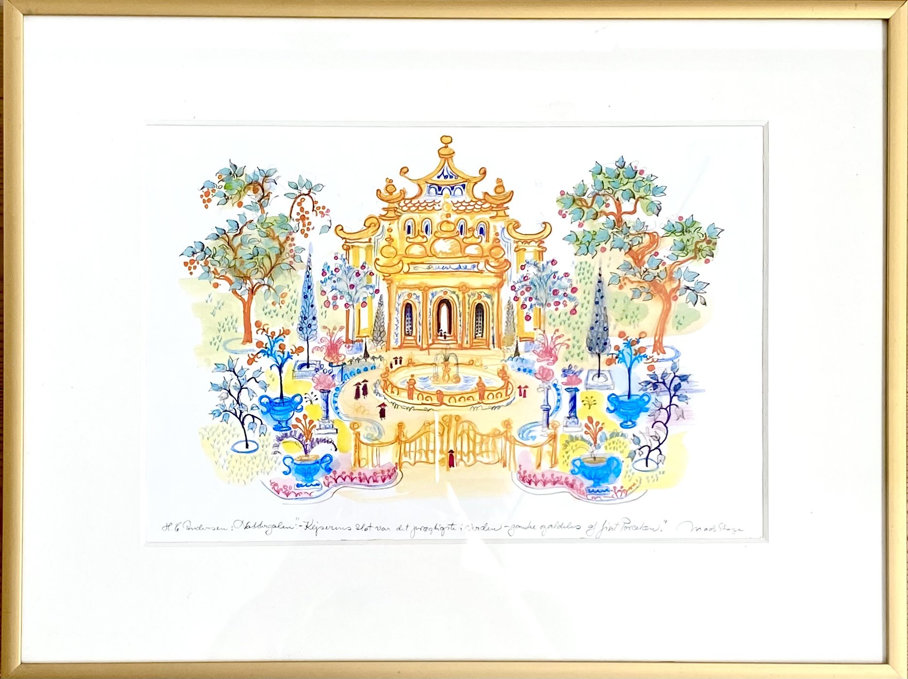Mads Stage akvarel med motiv af H.C. Andersens eventyr: "Nattergalen". Billedet er indrammet i skifteramme med guldfarvet aluminiumskant.