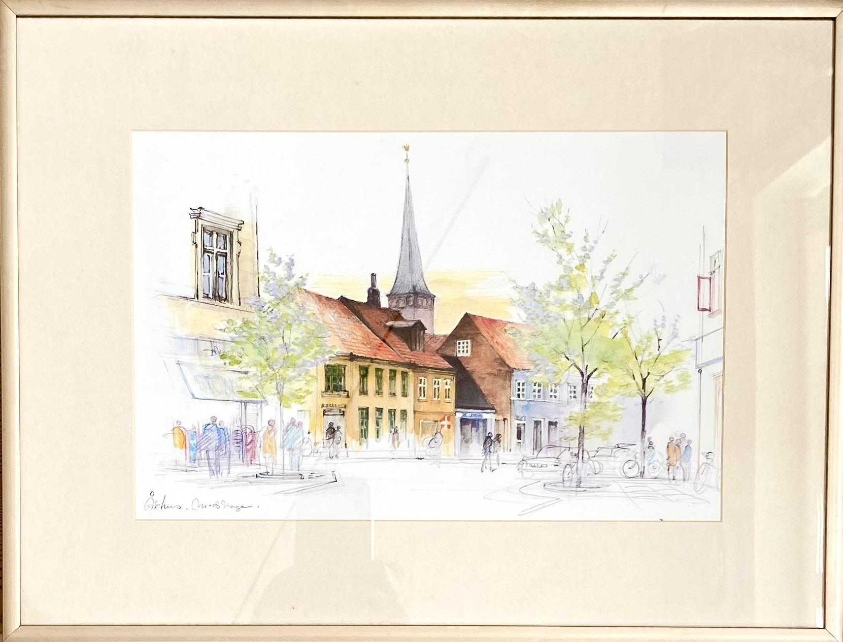 Mads Stage akvarel med motiv af: "Århus". Billedet er indrammet i skifteramme med kobberfarvet aluminiumskant.