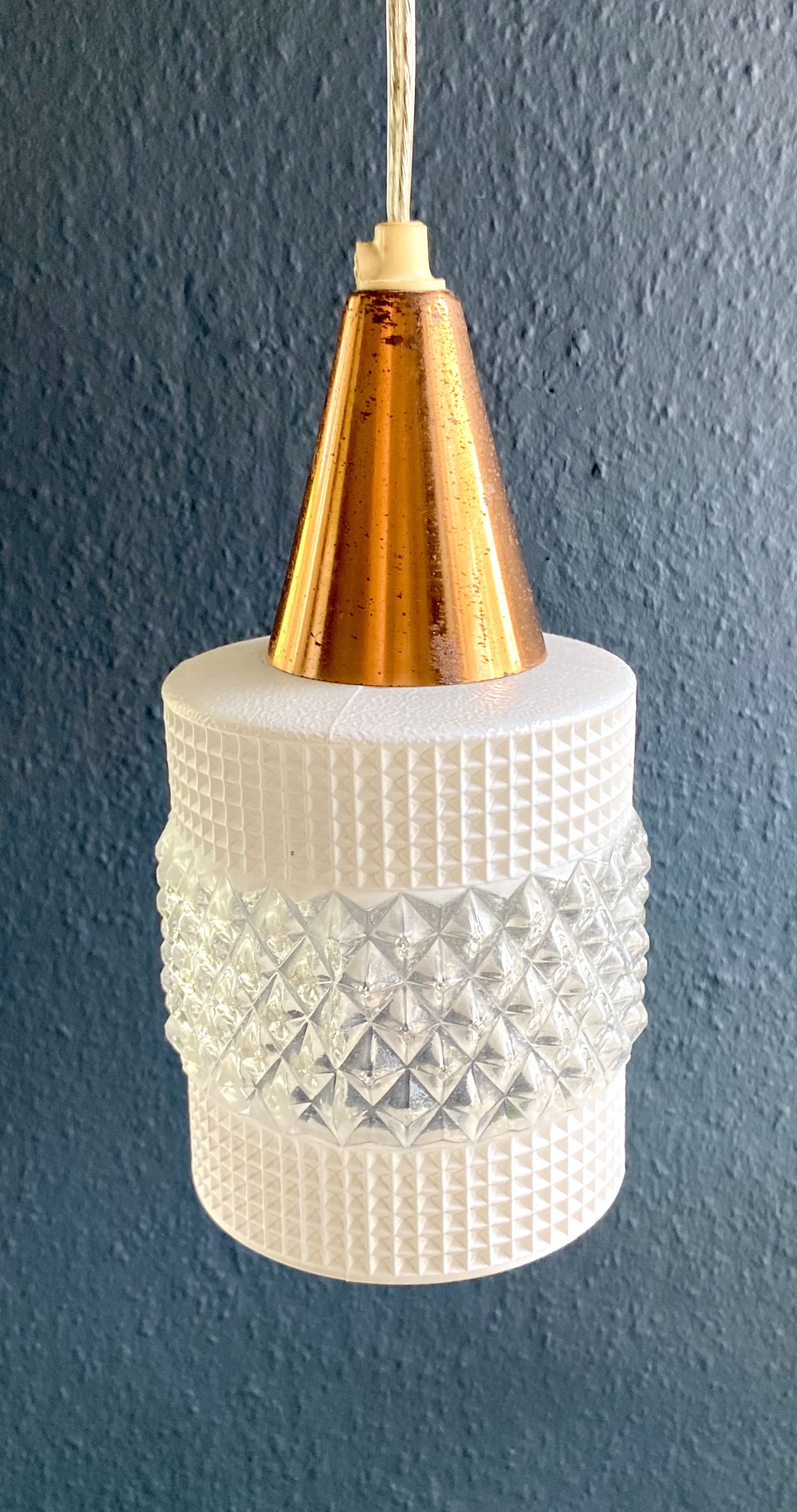 Retro loftspendel i hvidt mønstret glas med ophæng i kobberbelagt metal.