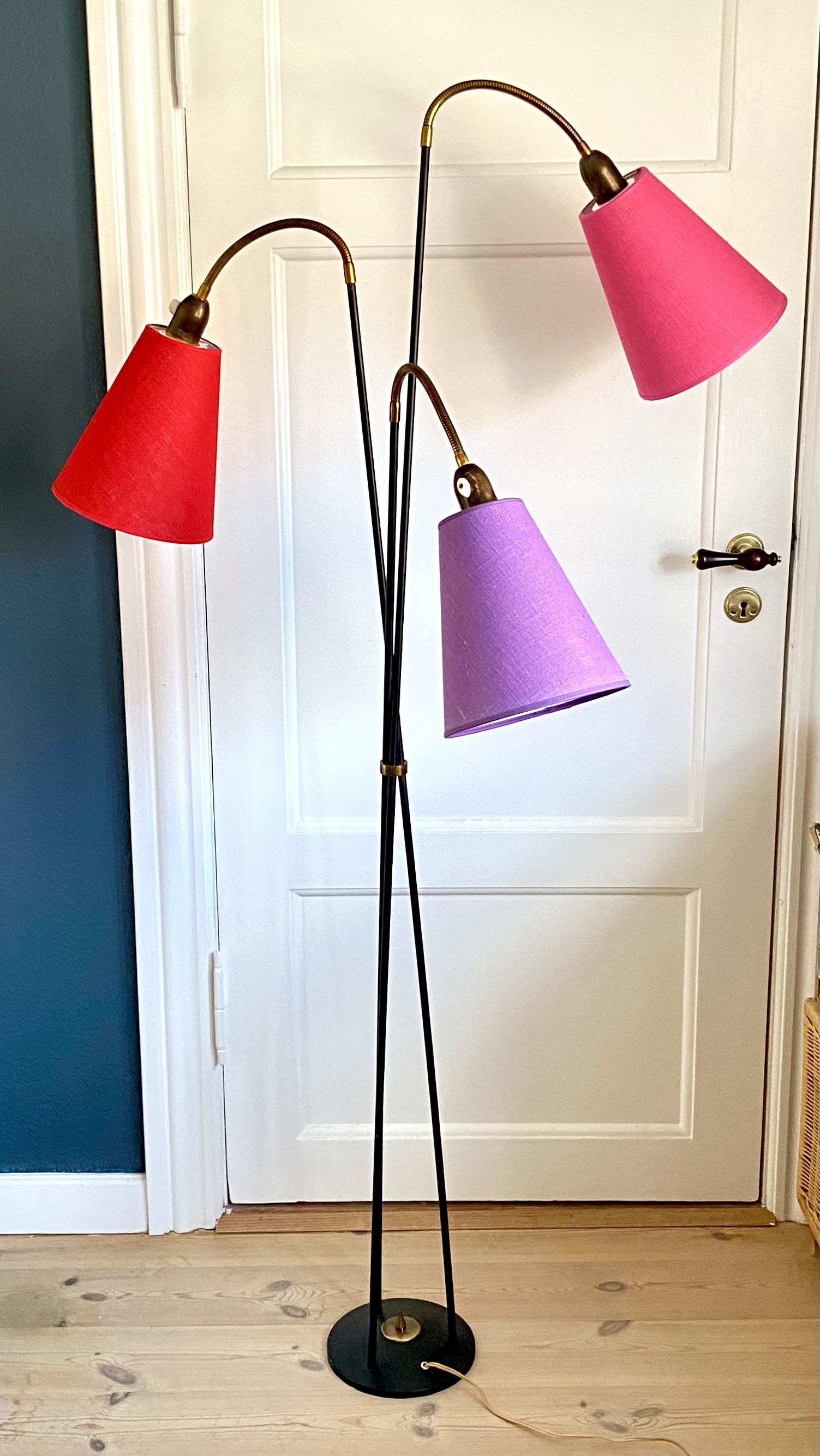 Retro "Trafiklys" gulvlampe/standerlampe i sortlakeret metal med 3 justerbare flexarme i messing - udført i 1950'erne. Lampen er monteret med 3 nye skærme i farverne: rød, lilla & pink.
