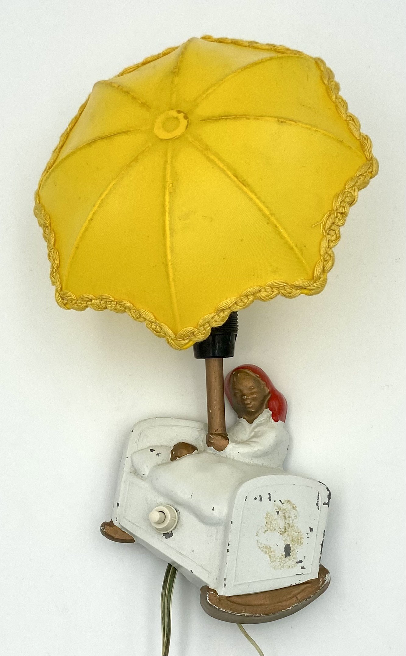 "Ole Lukøje" natlampe/sengelampe med gul skærm fra OLUK - produceret i perioden 1950'erne - 1960'erne. Lampen indeholder en indbygget spilledåse, som spiller "Den Lille Ole Med Paraplyen", når man trækker i snoren.