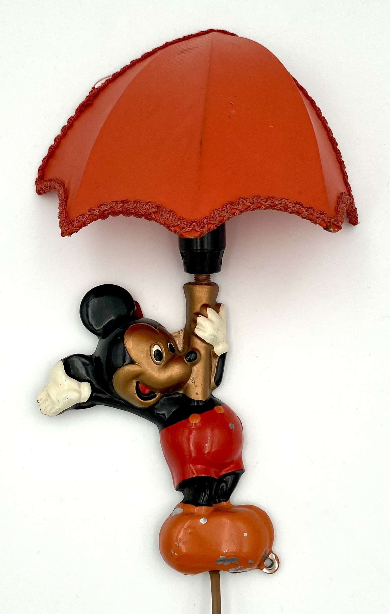 "Mickey Mouse" natlampe/sengelampe med rød skærm fra OLUK. Lampen er produceret i perioden 1950'erne - 1960'erne.